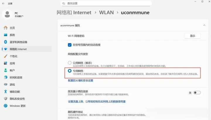 设置方法:设置—网络和Internet—WLAN—属性— 在网络配置文件类型中选择专用网络