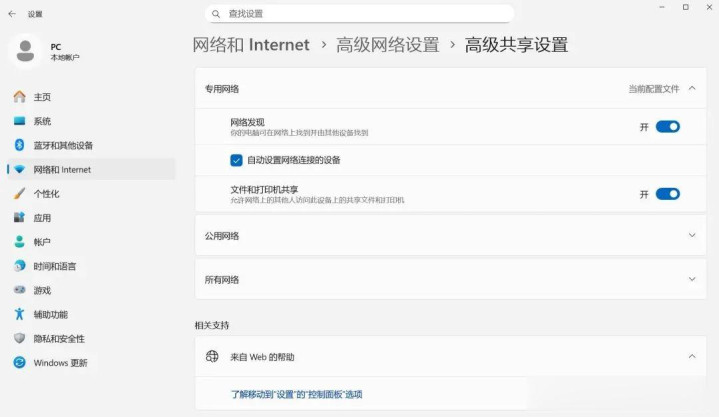 方法:设置—网络和Internet—高级网络设置—高级共享设置—展开专用网络,确认“网络发现”与“文件和打印机共享”都已开启。